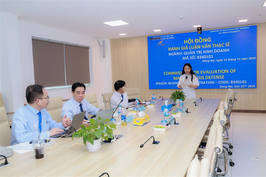 Ngày 23 tháng 12 năm 2025, tại phòng họp cơ sở 1 của Trường Đại học Lạc Hồng (LHU), 08 học viên ngành Quản trị kinh doanh đã xuất sắc hoàn thành và bảo vệ luận văn thạc sĩ của mình. Buổi bảo vệ diễn ra trong không khí trang trọng và đầy tính học thuật, đánh dấu một bước ngoặt quan trọng trong hành trình học tập và nghiên cứu của các học viên.