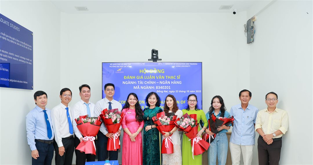 Ngày 23 tháng 10 năm 2025, tại phòng B107 (Phòng tiến sĩ) cơ sở 1 của Trường Đại học Lạc Hồng (LHU), Hội đồng đánh giá luận văn thạc sĩ chuyên ngành Tài chính - Ngân hàng đã tổ chức buổi bảo vệ luận văn cho 05 học viên. Buổi lễ diễn ra trong không khí trang trọng và đầy tính học thuật, với sự tham gia của các nhà khoa học, giảng viên uy tín và các chuyên gia đầu ngành.