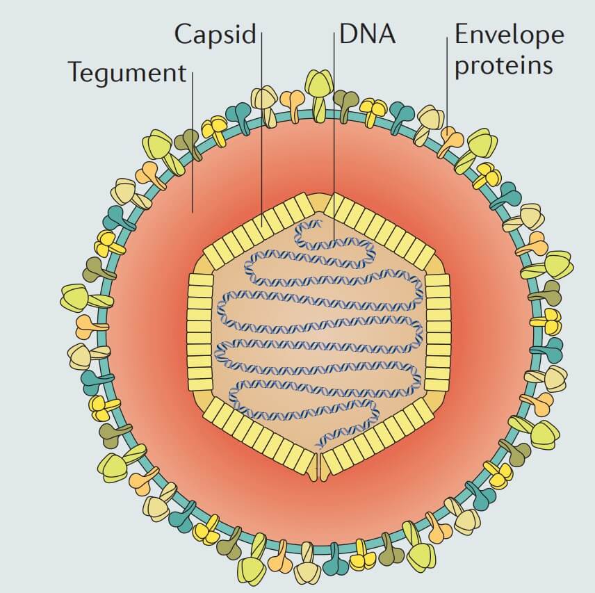 Similar to other herpesviruses, VZV consists of four major components: